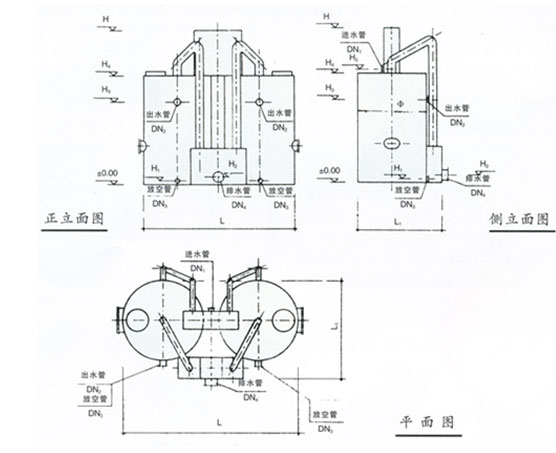 注:處理水量大于150M3/H時(shí),需多格濾罐組成,可根據(jù)具體條件靈活布置。設(shè)備外形有圓形或方形可選。