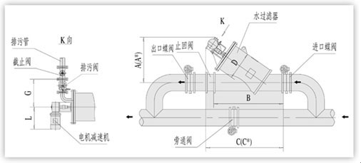 系列自清洗過濾器(習(xí)慣又稱電動(dòng)刷式過濾器)是一種全自動(dòng)電動(dòng)清洗過濾器,過濾精度可達(dá)20微米。其主要結(jié)構(gòu)是在過濾器濾網(wǎng)內(nèi)安裝一套刷子,刷子由電機(jī)帶動(dòng)旋轉(zhuǎn),在過濾器 端蓋上安裝一個(gè)電磁排污閥。清洗時(shí),來(lái)自壓差開關(guān)的信號(hào)傳給控制盤,控制盤打開排污閥同時(shí)啟動(dòng)電機(jī),帶動(dòng)刷子旋轉(zhuǎn)刷掉污物雜質(zhì),在水力的作用下,通過排污閥排出過濾無(wú)需斷流。過濾和清洗水流從過濾器進(jìn)口流人,經(jīng)過濾網(wǎng)后從出口流出,當(dāng)水流中的雜質(zhì)顆粒不斷地在濾網(wǎng)的內(nèi)表面堆積,使得過濾器的上下游壓差增大,當(dāng)過濾器上下游(進(jìn)出口)壓差達(dá)到預(yù)定值時(shí)(0.05 MPa),壓差開關(guān)便傳遞信號(hào)給控制盤,控制盤啟動(dòng)電機(jī)帶動(dòng)刷子旋轉(zhuǎn)刷掉濾網(wǎng)上的污物雜質(zhì)。同時(shí)打開排污閥,污物排走。