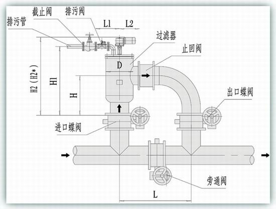 型號(hào) | 管徑 (mm) | 過濾 流量 (m3/h) | 過濾 面積 (cm2) | 排污 閥DN (mm) | 一次清 洗水量 (L) | 電機(jī) 功率 (KW) | 重量 (Kg) | D (mm) | H (mm) | H1 (mm) | H2 (mm) | H2 (mm) | L1 (mm) | L2 (mm) | L (mm) |
