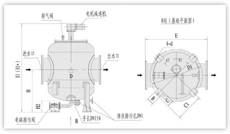 型號(hào) | 管徑 mm | 過濾 流量 m3/h | 過濾面積 cm2 | 電磁排污閥DN1 mm | 一次清洗水量L | 清洗排污閥DN1 mm | 電機(jī)功率 KW | 重量 Kg | D mm | H mm | H1 mm | H1 mm | H2 mm | E mm | D1 mm | B mm | C mm | C1 mm | D mm |